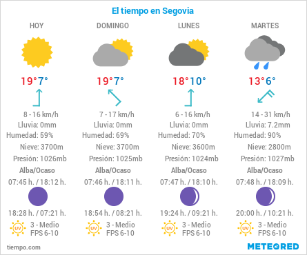 El Tiempo en Segovia el 31 de Octubre de 2020, el día de hoy tendremos en Segovia Capital cielos despejados durante prácticamente todo el día. según la Agencia Estatal de Meteorología (AEMET).