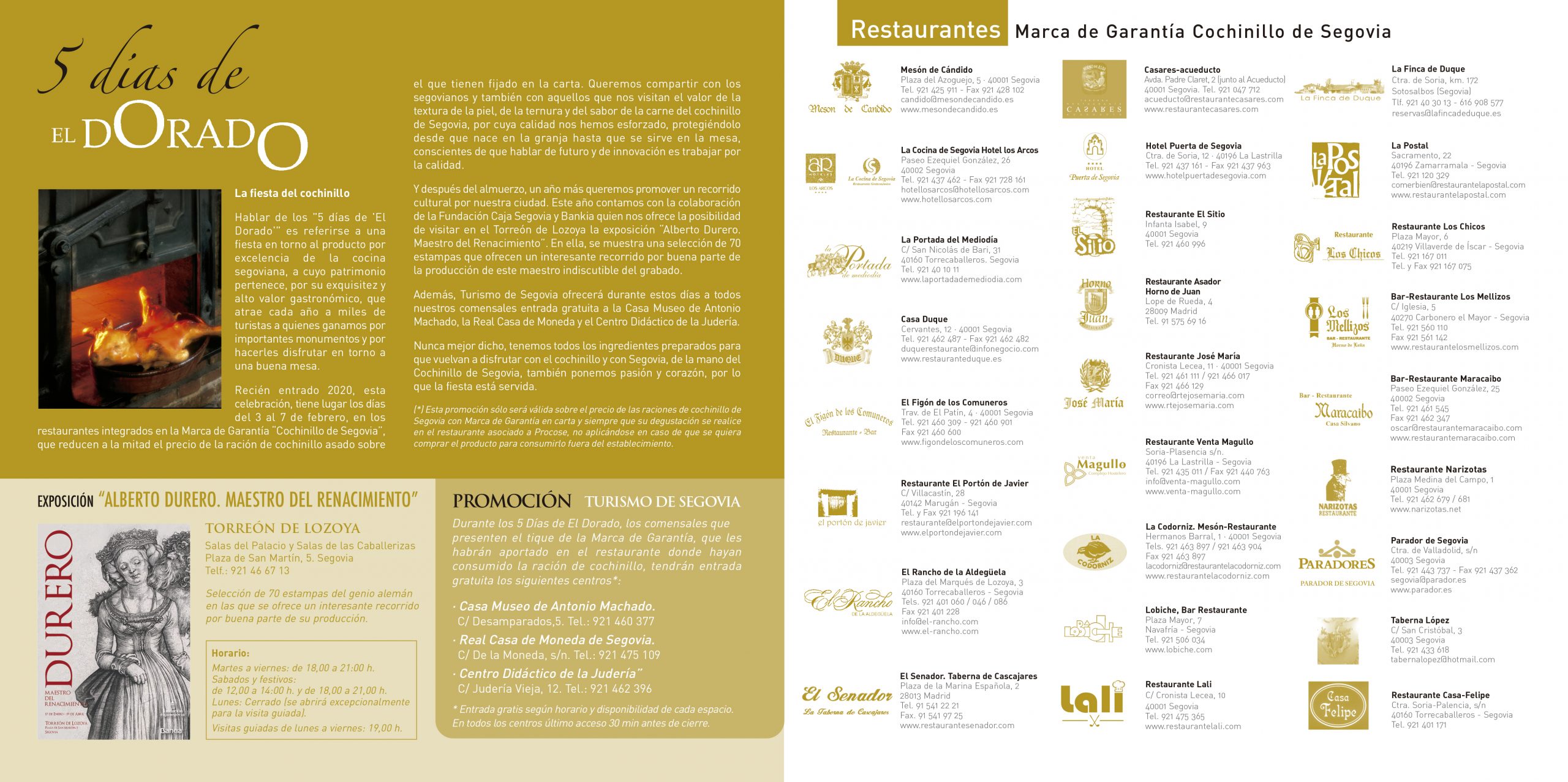 También, gracias a Turismo de Segovia, Durante los «5 Días de ‘El Dorado’», los comensales que presenten el tique que se ha entregado en el restaurante de la marca de garantía donde hayan consumido la ración de cochinillo, tendrán entrada gratuita en la Casa Museo de Antonio Machado, la Real Casa de la Moneda de Segovia y el Centro Didáctico de la Judería.