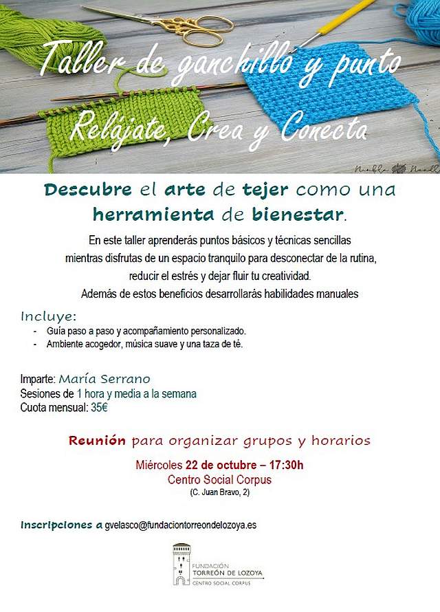 Miércoles 22 – 17:30. Reunión para organizar el Taller de Ganchillo y Punto que impartirá María Serrano (reserva tu plaza – gvelasco@fundaciontorreondelozoya.es)