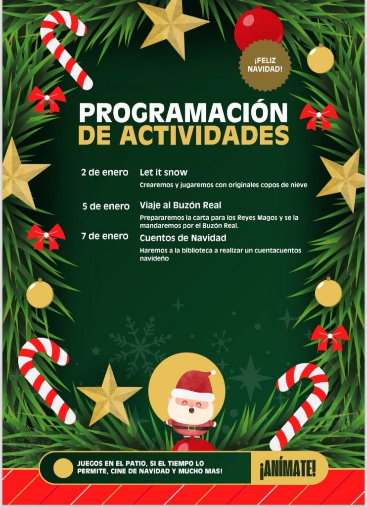 Actividades Navideñas en Hontanares de Eresma, ¡La Navidad llega cargada de actividades para toda la familia! La programación comienza el día 22 con la creación de felicitaciones navideñas («Christmas»). Los días siguientes están repletos de planes divertidos: un viaje al Buzón Real el día 23, elaboración de personajes navideños el 26, un gran Bingo con sorpresas el 29 y una fiesta pre-fin de año el día 30 para ir ensayando las uvas. Muchas de estas actividades incluyen juegos en el patio si el tiempo lo permite.