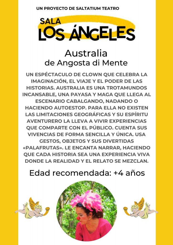 Australia de Angosta di Mente en Los Ángeles de San Rafael, El sábado 7 de febrero a las 12:00 h, la Sala Los Ángeles (C/ Río Tajo 42, Los Ángeles de San Rafael) presenta «Australia», un espectáculo de clown familiar a cargo de Angosta di Mente. Esta función está recomendada para niños y niñas a partir de los 4 años.