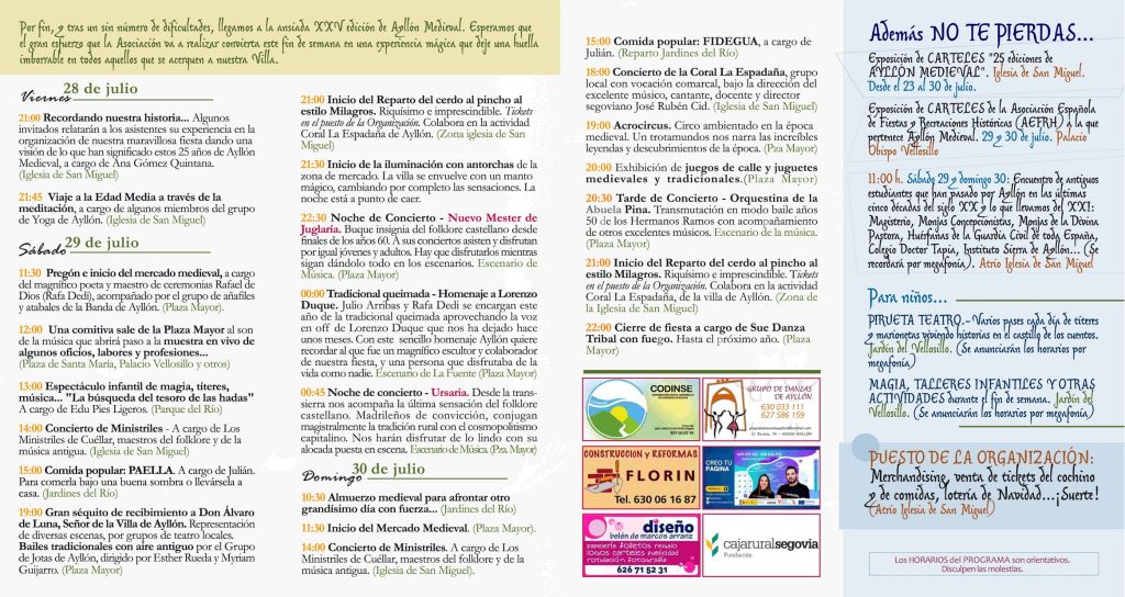 Un 25 aniversario que servirá también para organizar una exposición de carteles de estas 25 ediciones de Ayllón Medieval. El sábado y el domingo, a las 11.00 horas, habrá un encuentro de antiguos alumnos que han pasado por esta localidad segoviana en las últimas cinco décadas del siglo XX y primeras del XXI, de Magisterio, Madres Concepcionistas, Monjas de la Divina Pastora, Huérfanas de la Guardia Civil de toda España, Colegio Doctor Tapia o el Instituto ‘Sierra de Ayllón’, entre otros, en el atrio de la Iglesia de San Miguel.