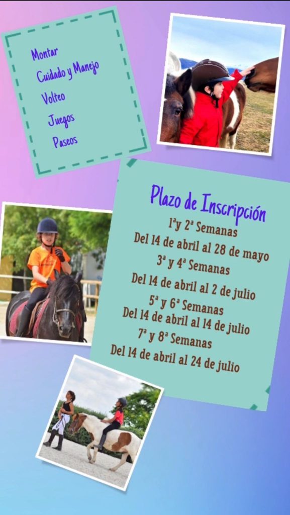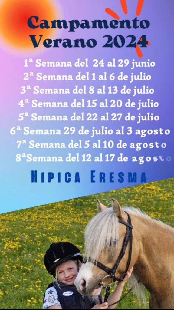 Campamento de Verano 2024 en Hípica Eresma, por semanas del 24 al 17 de Agosto de 2024. Para niños de 7 a 16 años.