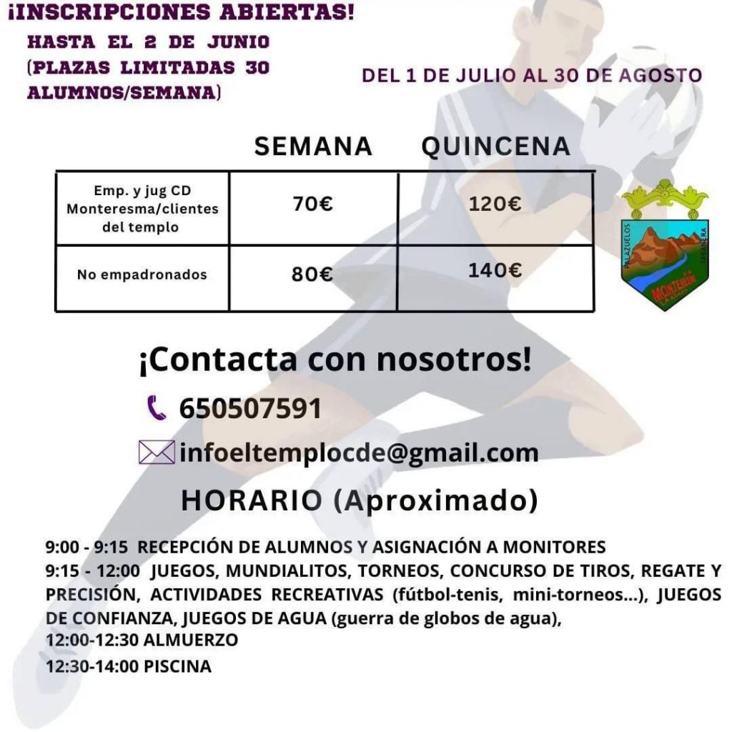 Campus de Verano Fútbol 2024 La Mina en Palazuelos de Eresma, del 1 de Julio al 30 de Agosto por semanas. De lunes a viernes de 9:00 a 14:00.