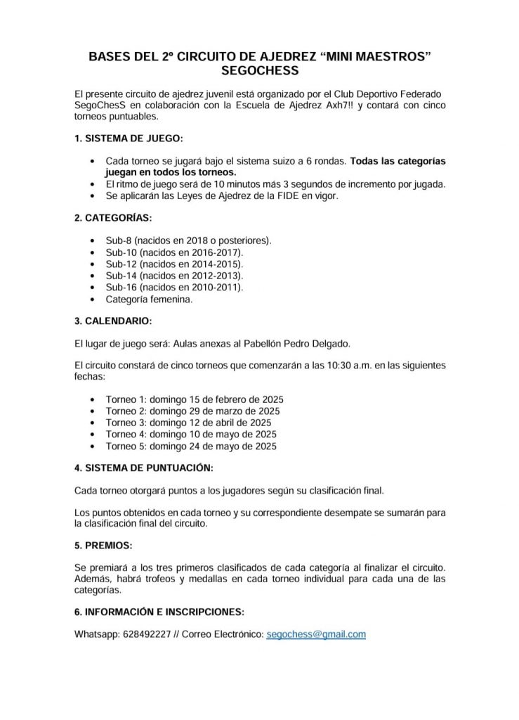 Circuito de ajedrez Mini-Maestros SegoChess en Segovia, El domingo 15 de febrero, a partir de las 10:30h, se inaugura la primera jornada de este circuito en las Aulas anexas al Pabellón Pedro Delgado, en Segovia. Este torneo está abierto a diversas categorías infantiles y juveniles (desde Sub-8 hasta Sub-16) y cuenta también con una categoría femenina.