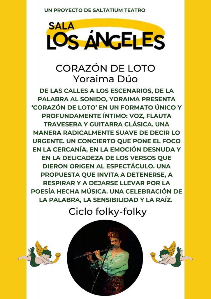 Yoraima Dúo presenta «Corazón de Loto», un espectáculo en formato único que combina voz, flauta travesera y guitarra clásica. Parte del ciclo «folky-folky», esta propuesta lleva la poesía de las calles al escenario, ofreciendo una experiencia radicalmente suave donde la emoción desnuda y la delicadeza de los versos son los protagonistas. Es una invitación a detenerse y respirar a través de la música.
