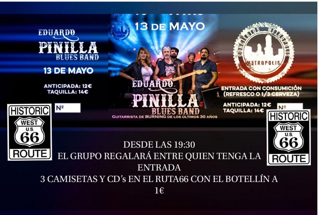 Concierto de Eduardo Pinilla Blues Band, 13 de mayo en Ruta 66 (C. de los Coches, 5). Actuará Eduardo Pinilla – Blues Band, el guitarrista de Burning los 30 últimos años.