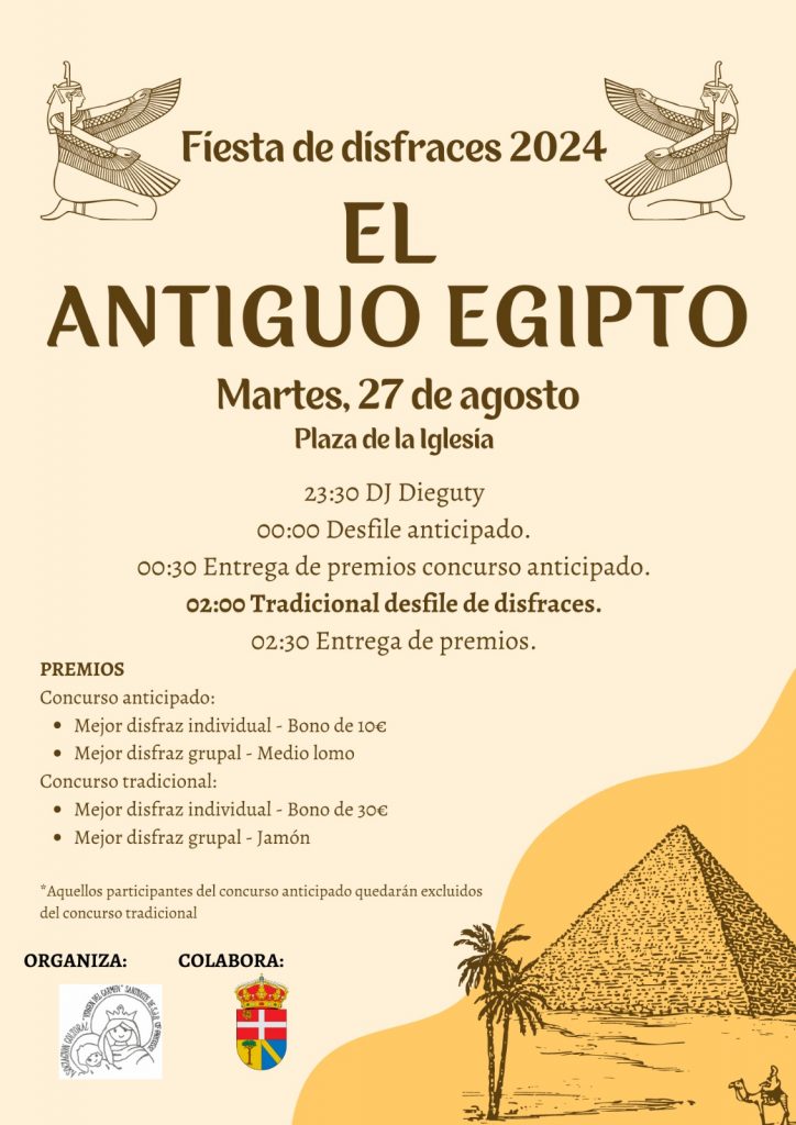 Fiesta de Disfraces – El Antiguo Egipto en Santiuste de San Juan Bautista, el 27 de Agosto de 2024, desde las 23:30.