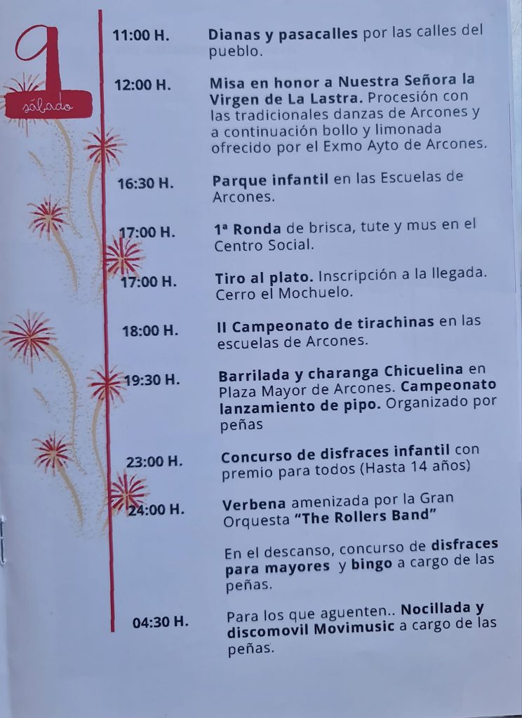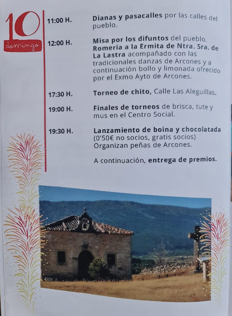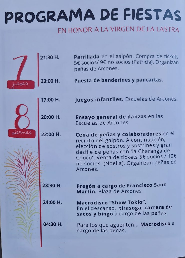 Fiestas 2023 en Arcones, en Honor a la Virgen de La Lastra, desde el 7 hasta el 10 de Septiembre de 2023, con Parrillada, Juegos Infantiles, Cena, Macrodisco, Misa, Parque Infantil, Tiro al Plato, Verbena…