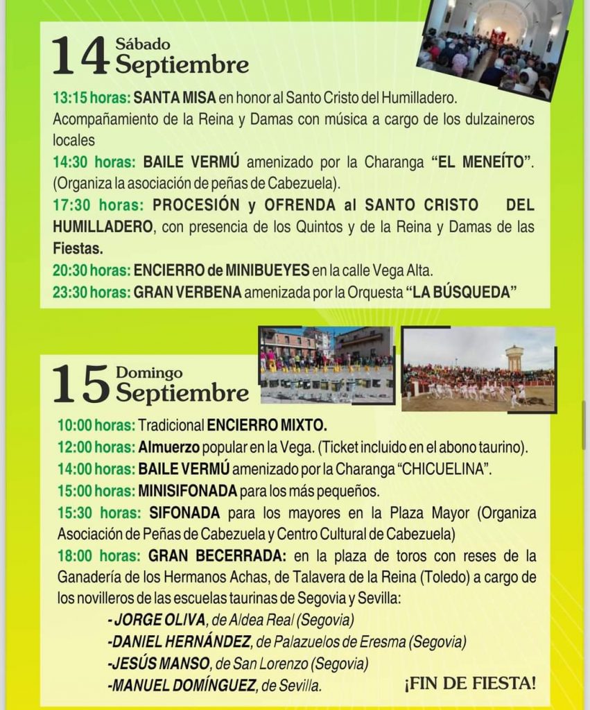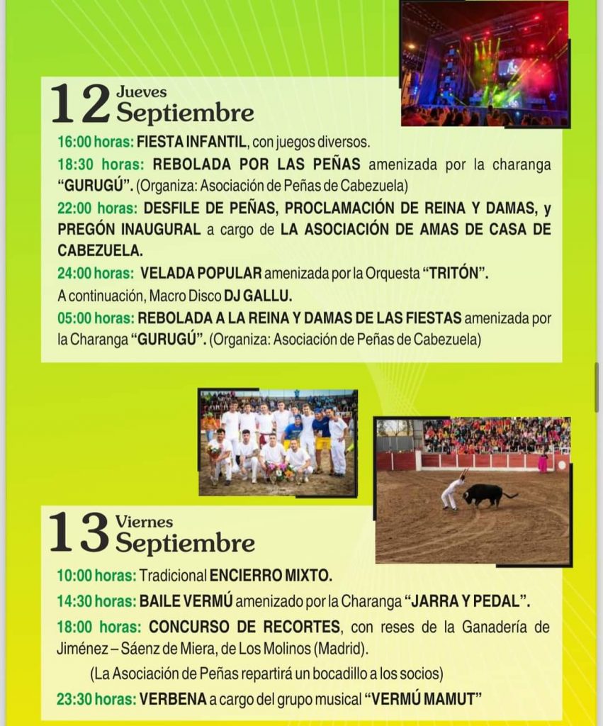 Fiestas 2024 en Cabezuela, del 12 al 15 de Septiembre de 2024, con Recortes, Becerrada, Encierro Infantil, Encierro Mixto, Fiesta Infantil, Desfile de Peñas, Orquestas…
