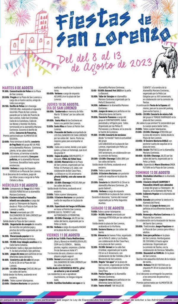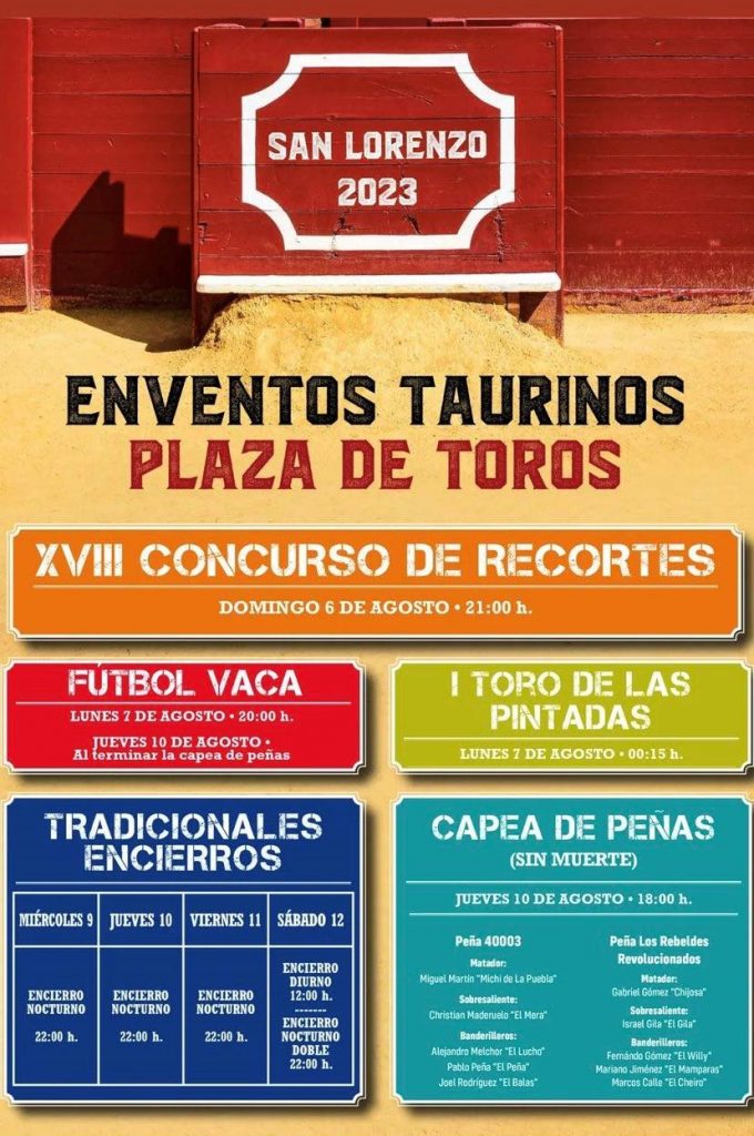 Fiestas en el Barrio de San Lorenzo 2023, del 8 al 13 de Agosto de 2023, Con Talleres, Fiesta de la Espuma, Recortes, Futbol Vaca, Toro de las Pintadas, Encierros, Capea de Peñas, Conciertos, DJ, Charangas, Juegos de Mesa, Juegos Tradicionales…