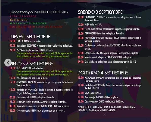 Fiestas en Honor a la Virgen de la Varga 2022 en Siguero, del 1 al 4 de Septiembre de 2022, con Chocolatada, Verbenas, Disfraces, Pasacalles, Misa, Campeonatos, Magia,