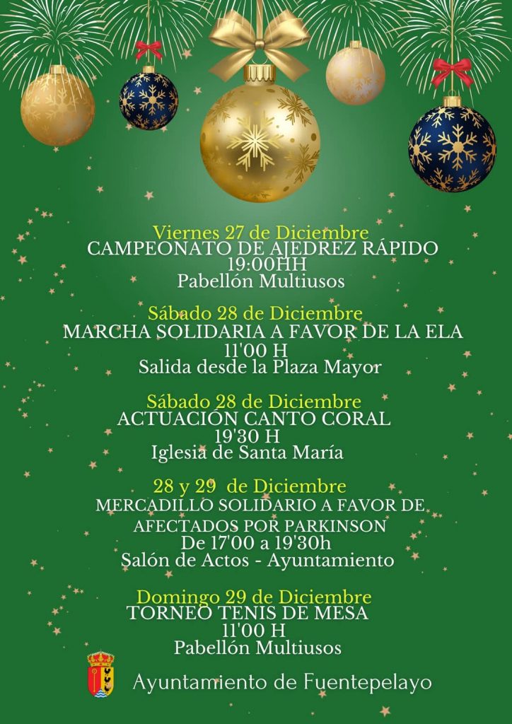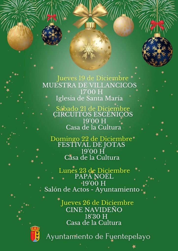 Fuentepelayo en Navidad 2024, del 19 de Diciembre de 2024 al 5 de Enero de 2025, con Villancicos, Circuitos Escénicos, Festival de Jotas, Papa Noel, Cine, Campeonato de Ajedrez, Marcha, Torneo Tenis de Mesa, San Silvestre, Cabalgata de Reyes.