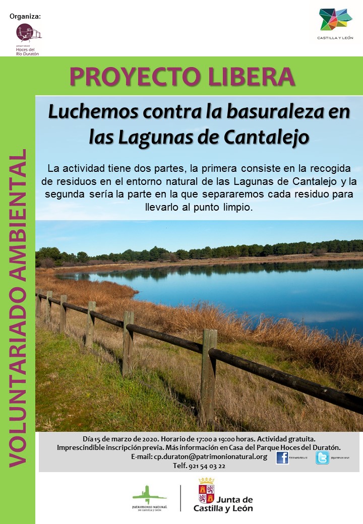 El próximo domingo 15 de marzo de 2020, a las 17:00 horas, la Casa del Parque de las Hoces del Duratón, ha organizado en las Lagunas de Cantalejo un voluntariado ambiental. Se han sumado al Proyecto Libera: Unidos contra la basuraleza con esta actividad, cuyo objetivo es limpiar la basura del entorno de las Lagunas de Cantalejo.
