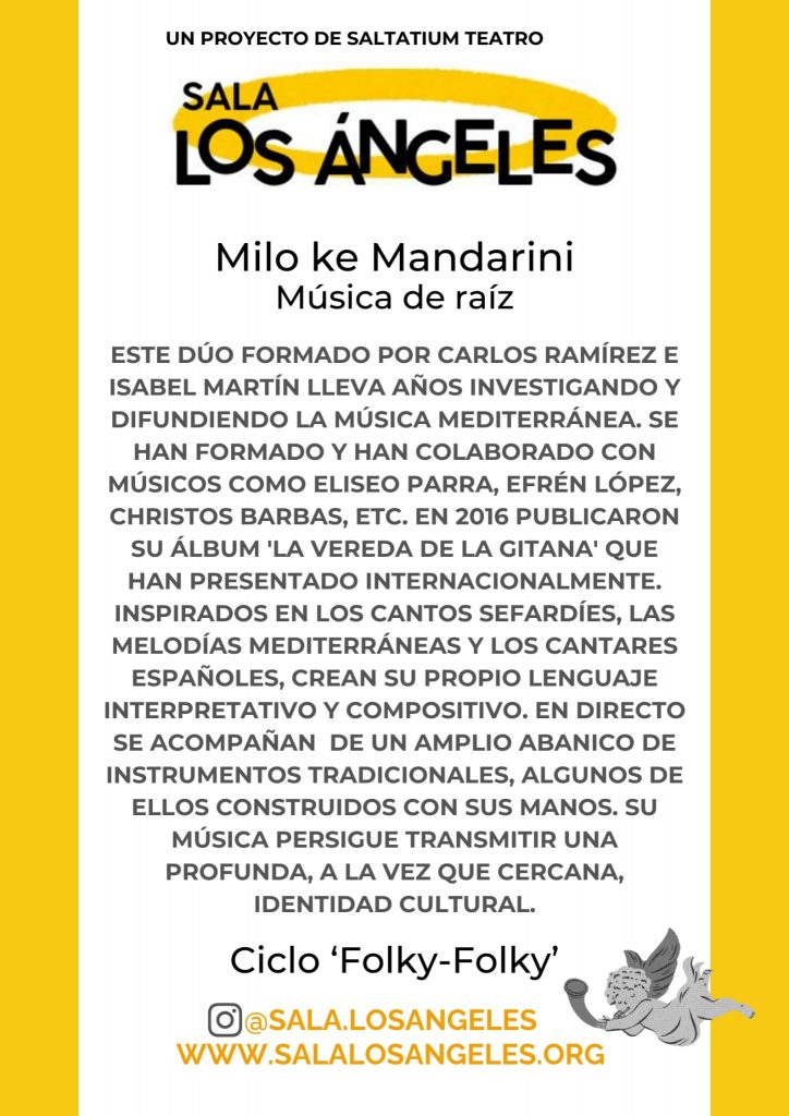 Milo Ke Mandarini en la Sala Los Ángeles, El próximo 7 de febrero a las 21:00h, la Sala Los Ángeles (C/ Río Tajo, 42, Los Ángeles de San Rafael) se llenará de sonidos ancestrales con el concierto de Milo Ke Mandarini. Este dúo ofrece una propuesta de «música de raíz» que promete un viaje sensorial por la cuenca del Mediterráneo.