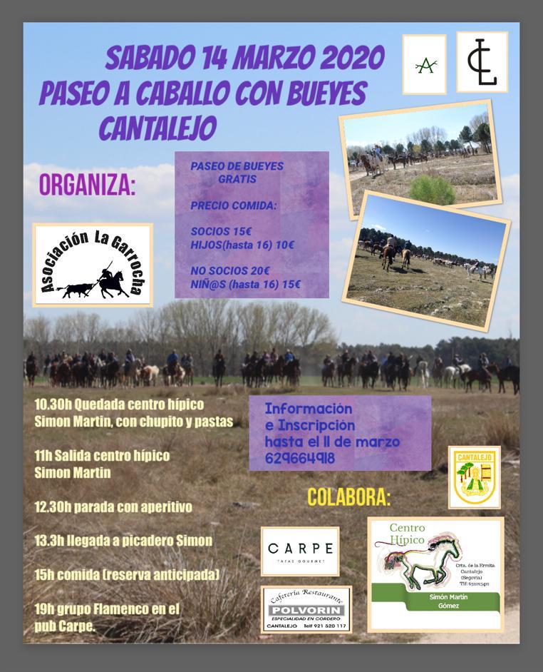 Paseo a caballo con bueyes en Cantalejo El 14 de marzo de 2020 la Asociación La Garrocha de Cantalejo ha organizado su ya tradicional paseo con bueyes a caballo. Comenzará a las