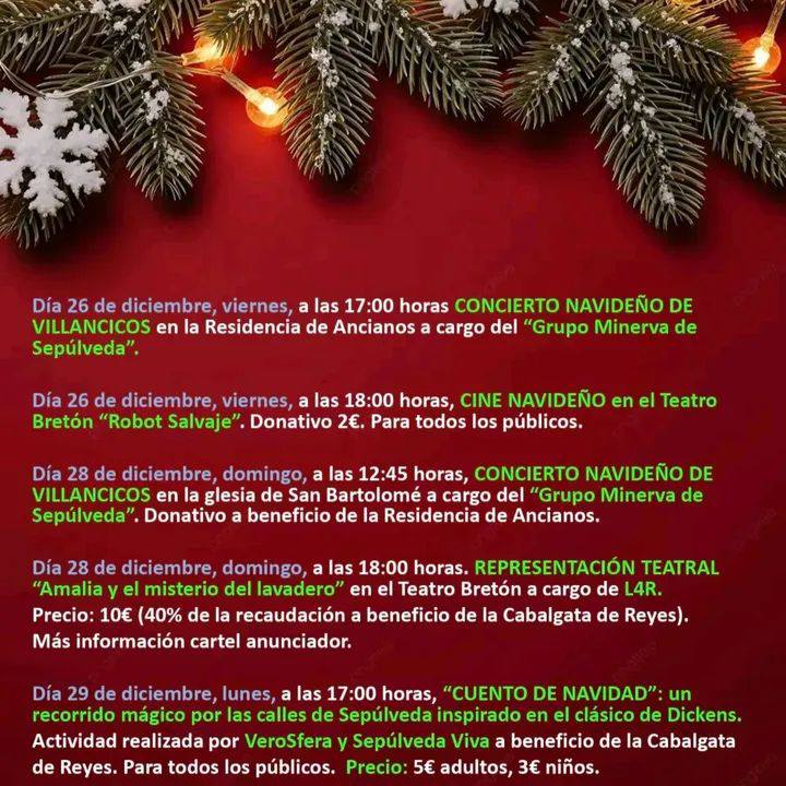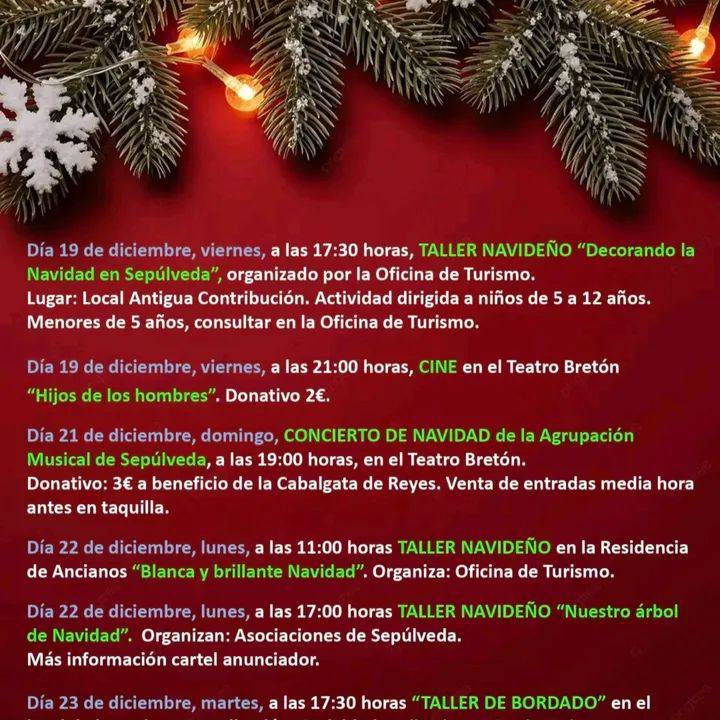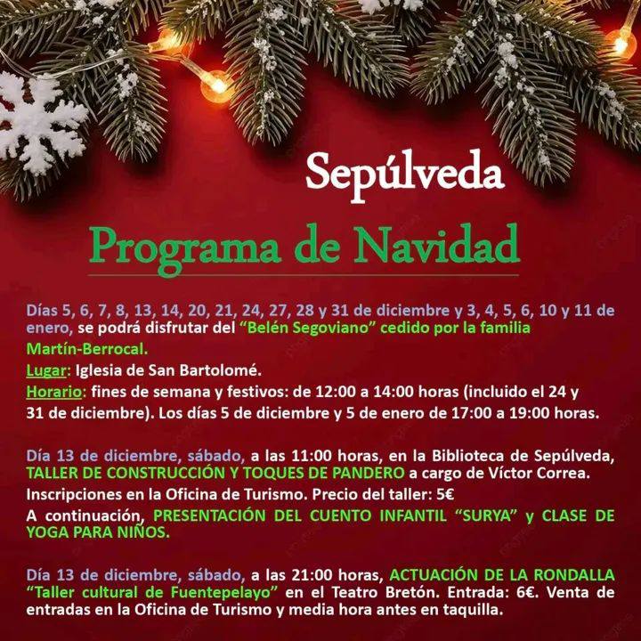 Programa de Navidad en Sepúlveda, Desde el viernes 5 de diciembre hasta el domingo 11 de enero, en horarios variados, se celebrarán múltiples eventos en la Iglesia de San Bartolomé, el Teatro Bretón y la Plaza de España de Sepúlveda.