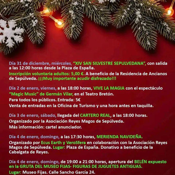 Para la recta final del año, no te pierdas la clásica XIV San Silvestre Sepulvedana el miércoles 31 de diciembre a las 12:00 horas, saliendo desde la Plaza de España (¡recuerda ir disfrazado!). El año nuevo comenzará con magia el 2 de enero en el Teatro Bretón y la llegada del Cartero Real el día 3. Finalmente, el domingo 4 de enero se celebrará una gran Merienda Navideña a las 17:30 en la Plaza de España y la apertura especial del Belén en el Museo Fijas.