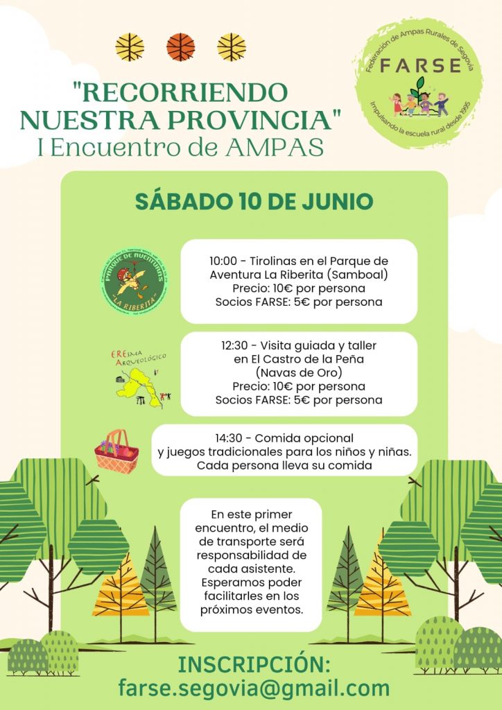 Recorriendo Nuestra Provincia – I Encuentro de AMPAS, el 10 de Junio de 2023, desde las 10 de la mañana con Tirolinas en Samboal, para continuar a las 12:30 con Visita Guiada en Navas de Oro para terminar con Comida a las 14:30, cada uno debe llevar su comida.