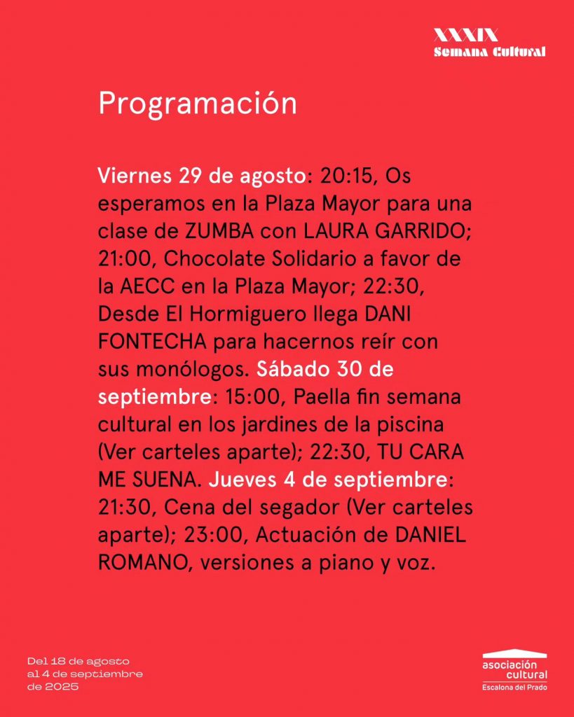 Semana Cultural 2025 en Escalona del Prado, Del 18 de agosto al 4 de septiembre de 2025, Escalona del Prado celebra su XXXIX Semana Cultural con una gran