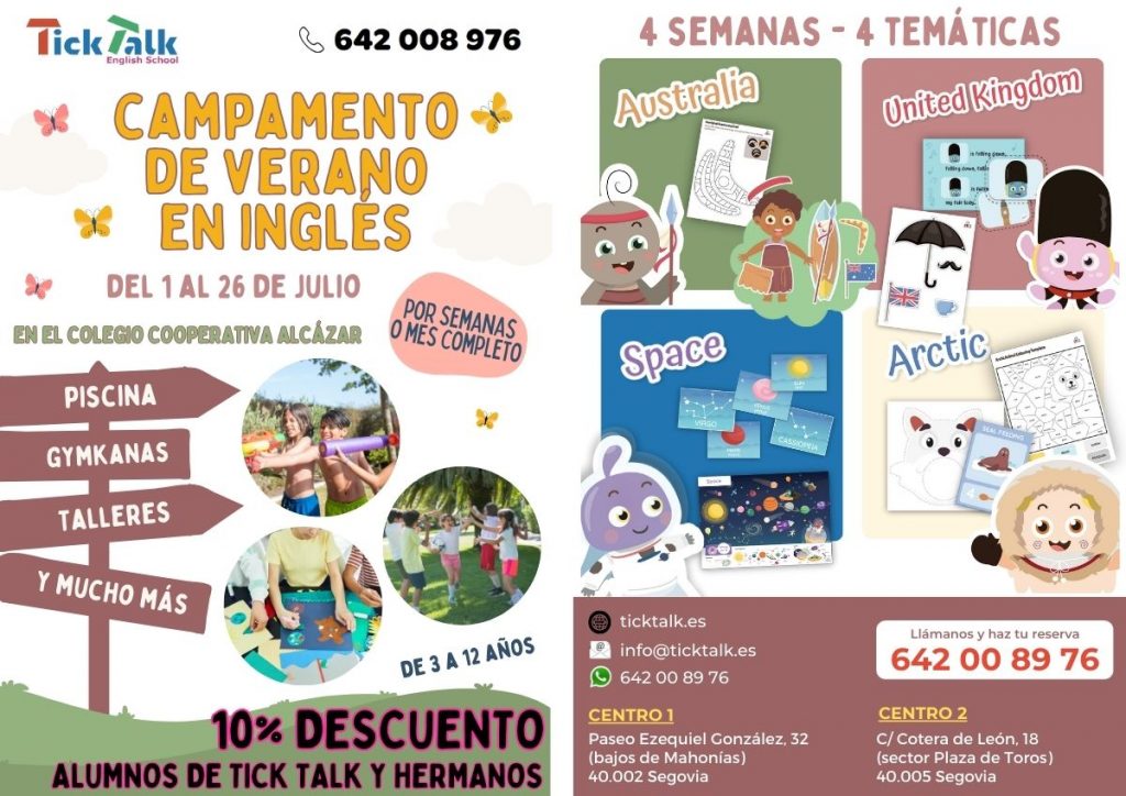 SUMMERCAMP en INGLÉS 100%, Tick Talk English School, una academia de inglés con dos centros de enseñanza en Segovia. El Campamento se llevara a cabo durante las 4