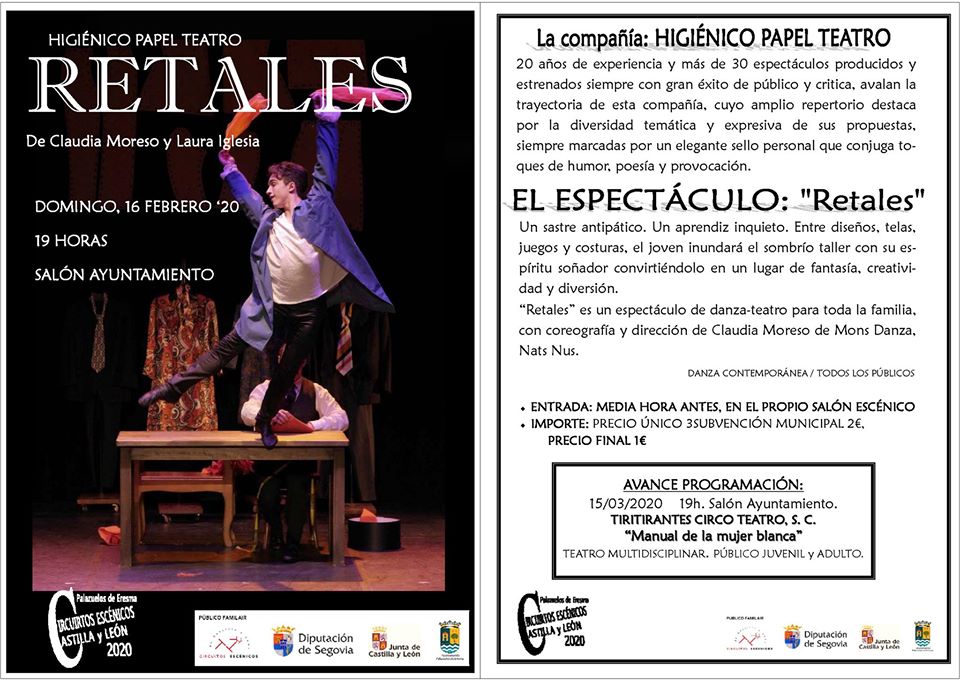 Teatro – Retales en Palazuelos de Eresma El Domingo 16 de Febrero de 2020 a las 19:00 en el Salón del Ayuntamiento de Palazuelos de Eresma. ESPECTACULO DE DANZA TEATRO. Grupo teatral: