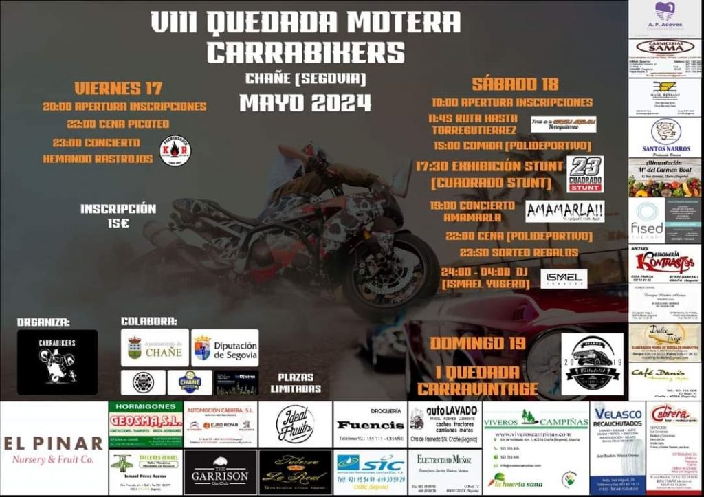 VIII Quedada Motera Carrabikers en Chañe, el 17 ,18 y 19 de Mayo de 2024, con Cena, Conciertos, Ruta, Exhibición, Cena, Sorteo…