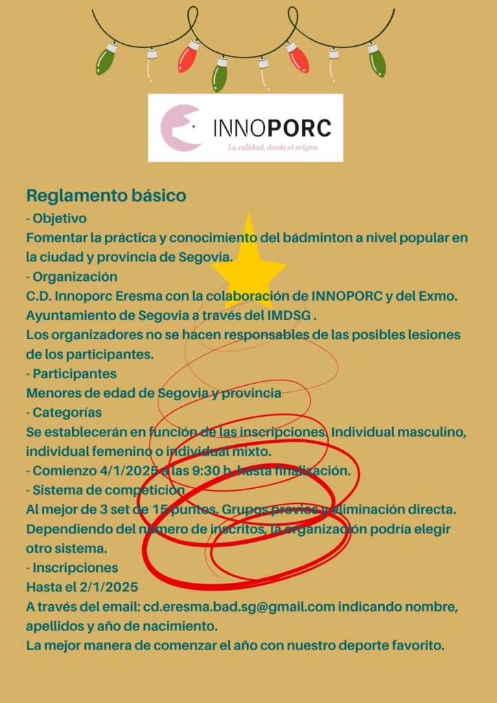 VIII Torneo de Navidad Ciudad de Segovia de Bádminton, El domingo 4 de enero de 2026, a partir de las 9:30 h, se celebrará en Segovia capital este torneo dedicado a menores de edad. Organizado por el C.D. Innoporc Eresma, el objetivo es fomentar el bádminton a nivel popular. Habrá categorías individuales masculinas, femeninas y mixtas. Las inscripciones están abiertas hasta el 2 de enero a través del correo cd.eresma.bad.sg@gmail.com.