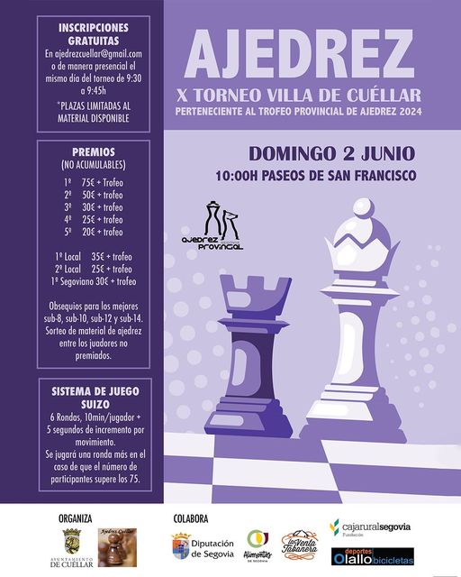 X Torneo Villa de Cuéllar de Ajedrez, el 2 de Junio de 2024, desde las 10:00 en los Paseos de San Francisco, perteneciente al trofeo provincial de Ajedrez 2024.