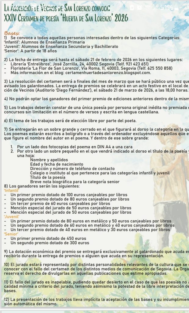 XXIV Certamen de Poesía Huerta de San Lorenzo, El plazo de entrega de obras está abierto hasta el sábado 21 de febrero de 2026, y se pueden entregar en la Librería Entrelibros o la Floristería La Flor de San Lorenzo en Segovia.