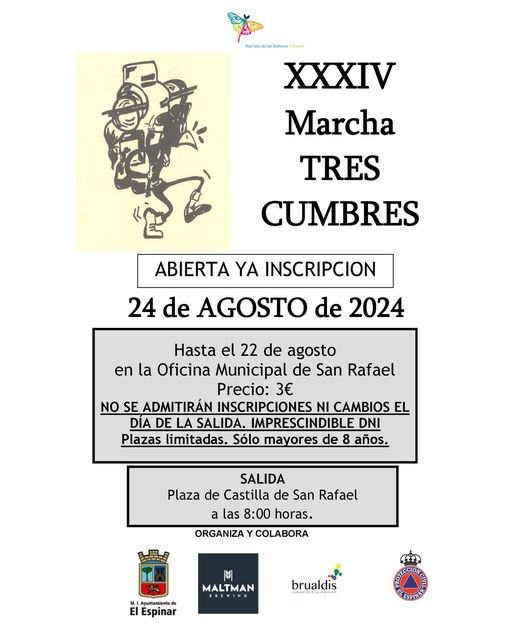 XXXIV Marcha Tres Cumbres,el 24 de Agosto de 2024 en San Rafael, precio 3 euros, Solo mayores de 8 años.
